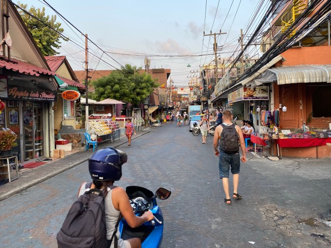 We rented scooters and headed for the beach and swam in crystal clear water then grabbed lunch at a small seaside place for a total of 10 bucks then headed to the top of the mountain for a view. We just made the 4:00 ferry and headed back to town and to the ship by 7 pm. Great day. I love Thailand